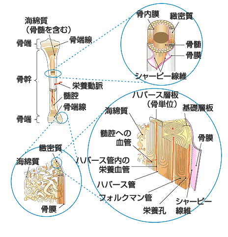貯蔵:骨質には無機物、骨髄腔には脂肪が貯蔵されている。主成分はリン酸カルシウムで、そのため骨形成にはカルシウム・リン・ビタミンDの摂取が不可欠である。
